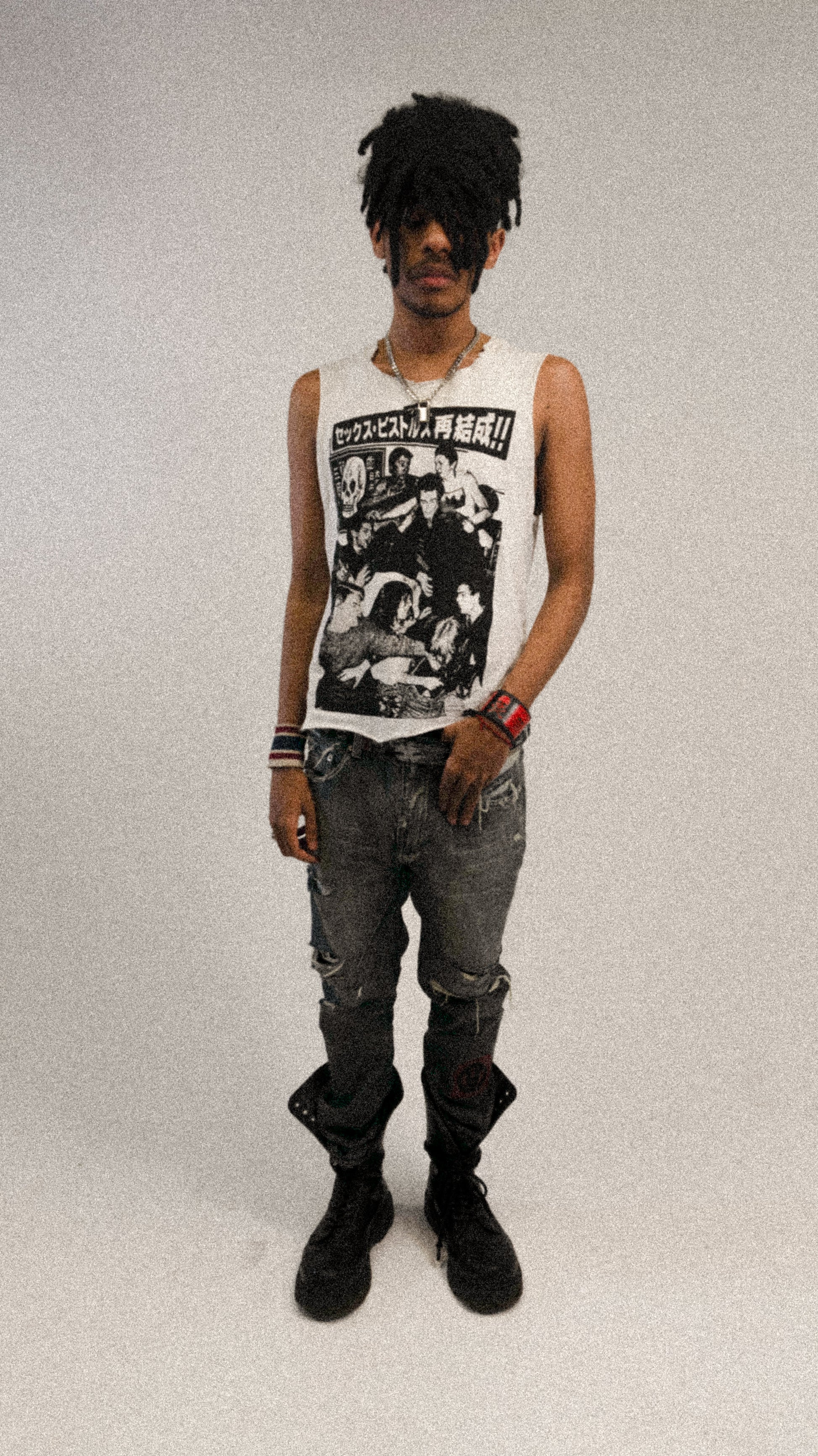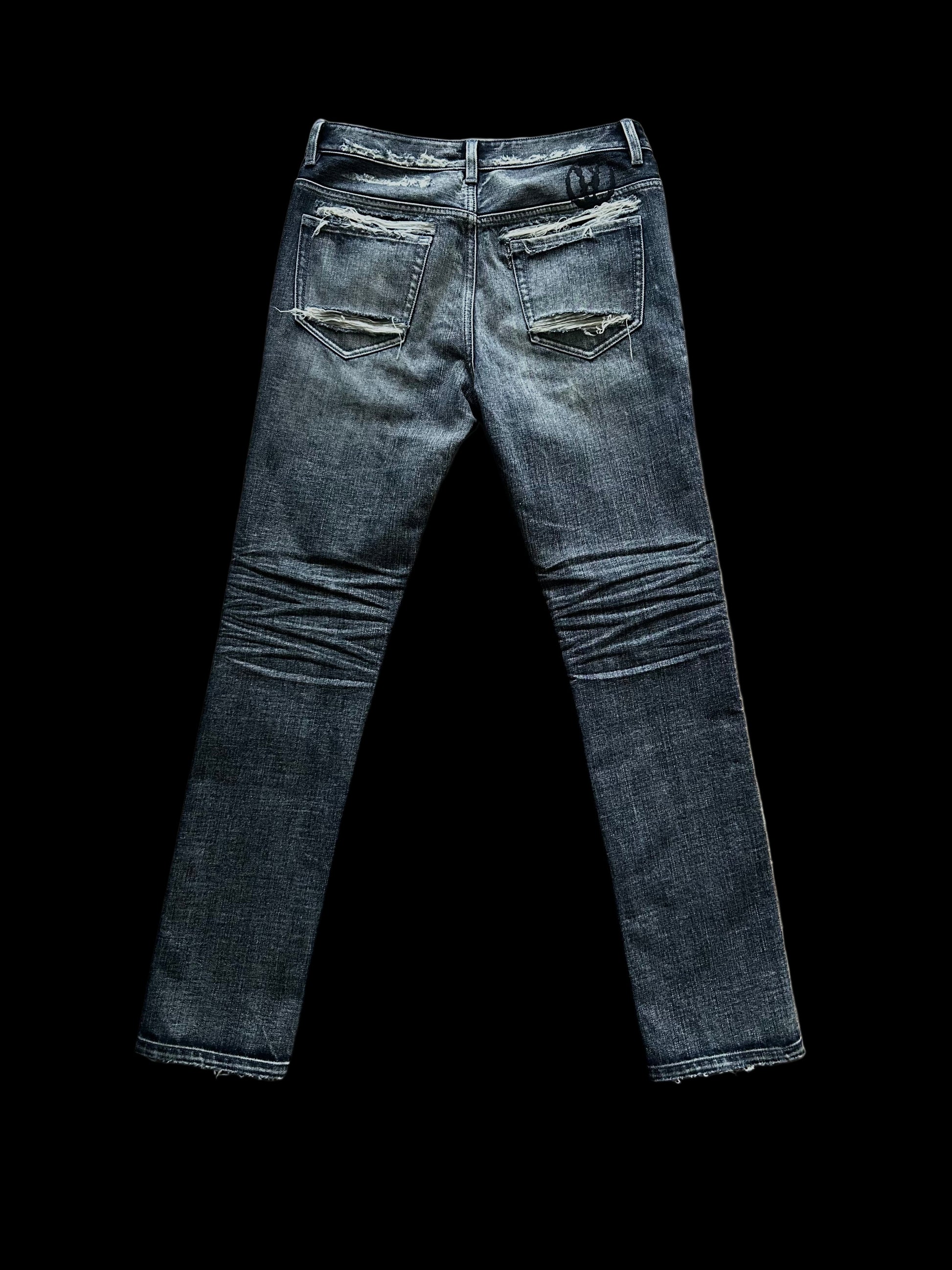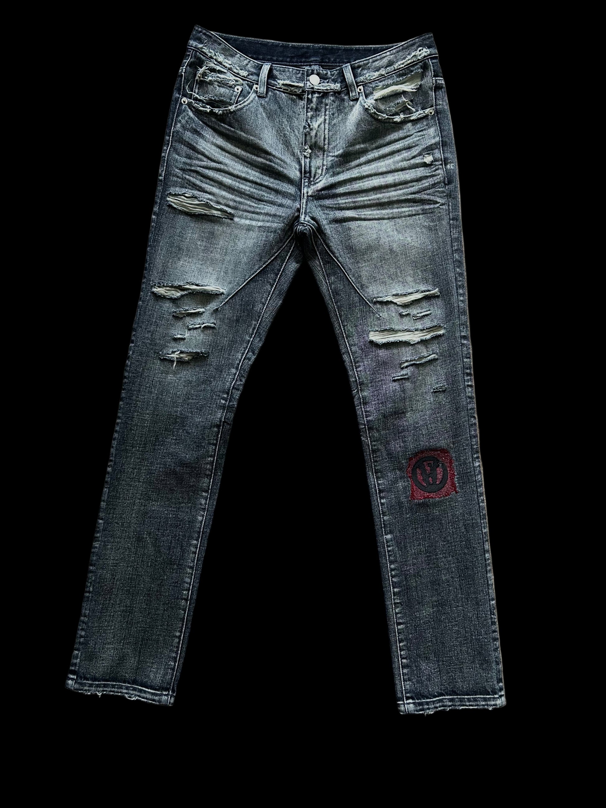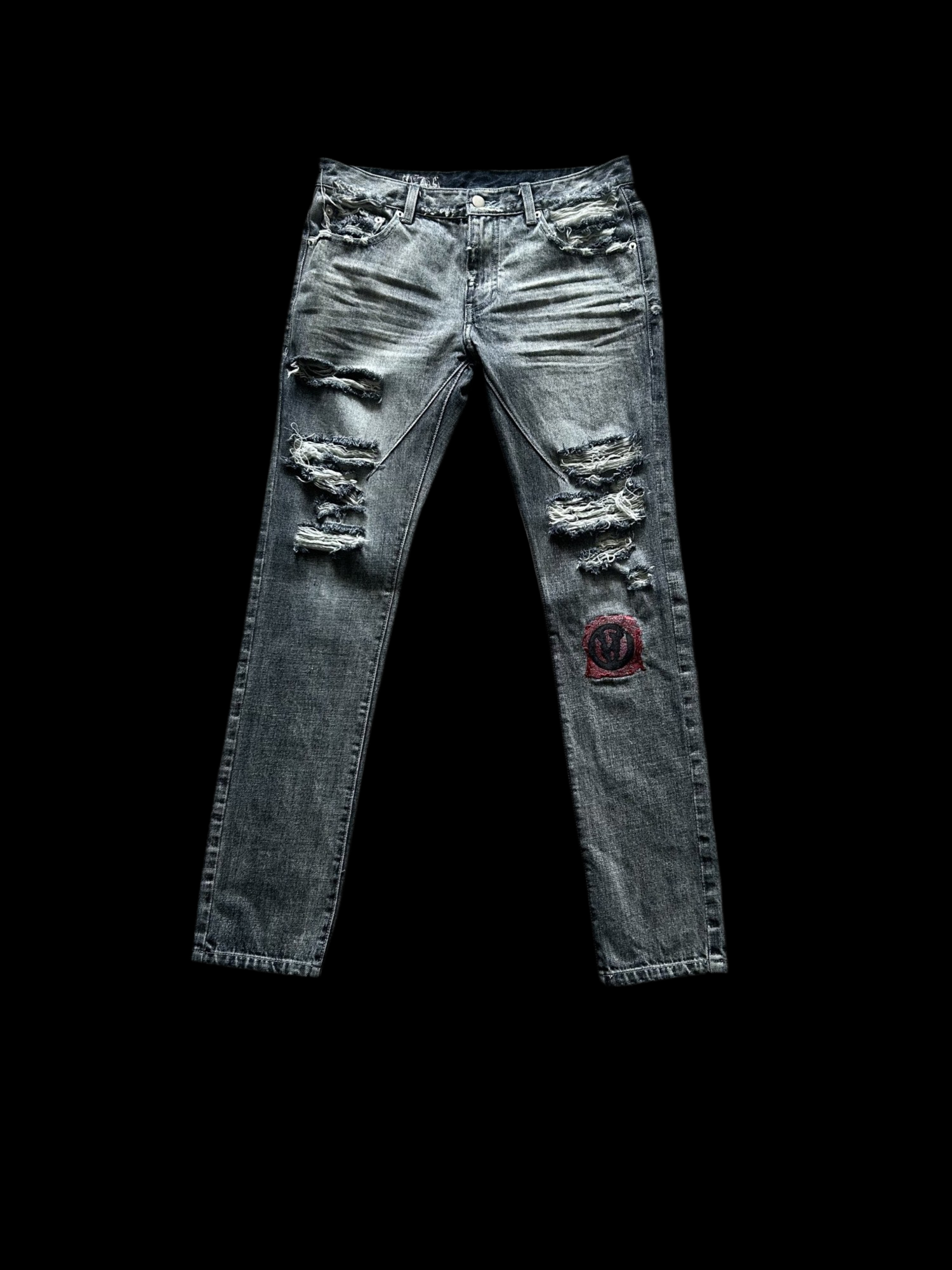 These jeans feature a dust denim wash, giving them a soft, faded appearance with subtle, worn-in character. They are distressed with multiple rips and frayed edges, The upside-down anarchy logo on the left knee is embroidered with bold red, creating a striking contrast against the distressed, dust-wash denim. The embroidery adds a textured, handcrafted element to the jeans, there is another similar logo embroidered on the back waistband.